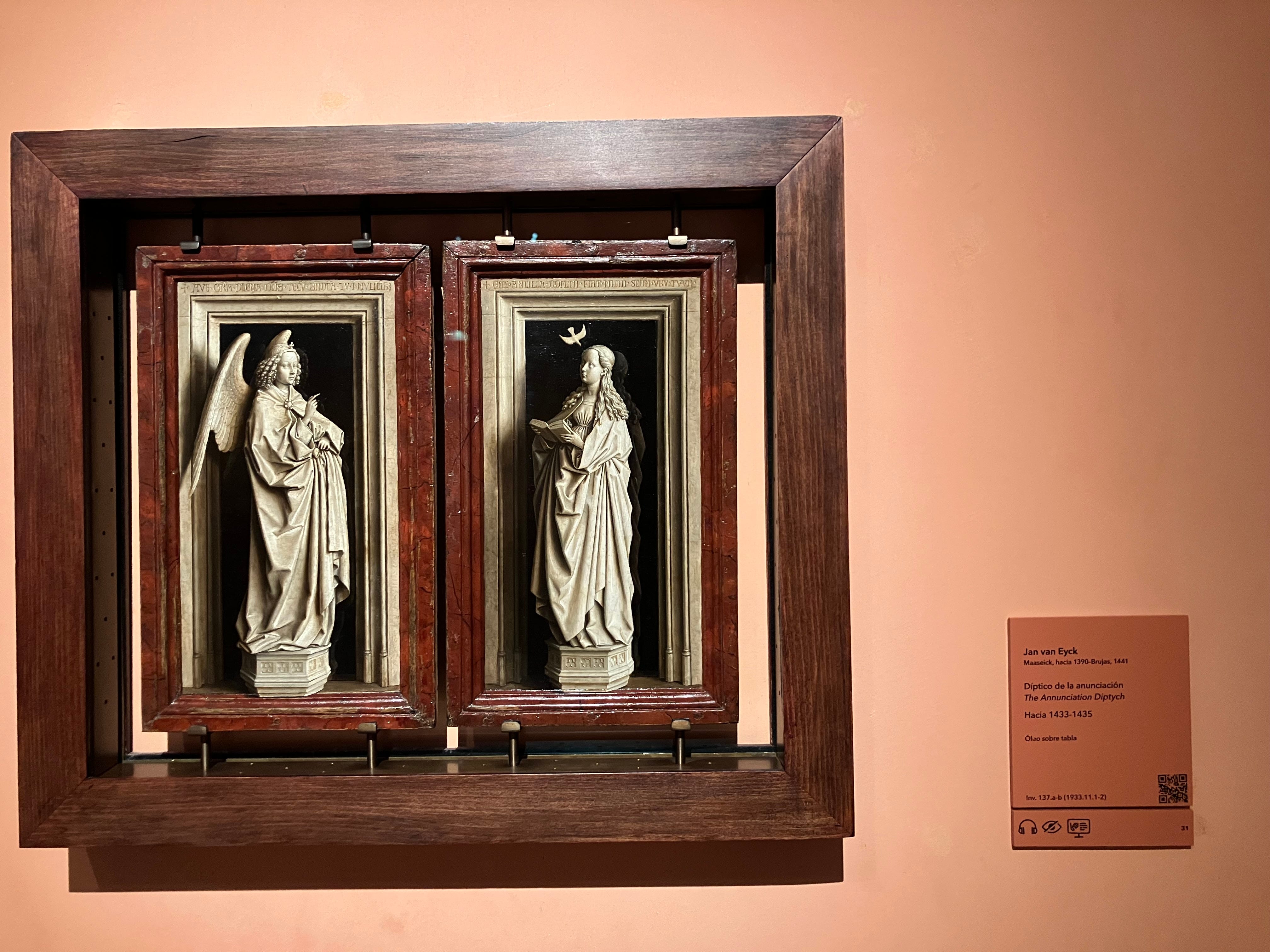 Despite my unease with this backstory, I loved much of what I saw there. One highlight was the works of grisaille, a trompe l’oeil technique where painters mimic other materials. Take a look at Jan Van Eyck’s diptych, below. Those delicate marble statues are painted, not sculpted! The inner wooden frames give a careful illusion of grain worn with age. The stone rectangles within the wooden frames are faux-carved with inscriptions from the Gospels. It’s an illusion within an illusion within another illusion. No photograph can do justice to the experience of standing before it, in wonder at the exquisite devotion and skill of its creation. It’s pretend, but it’s real.