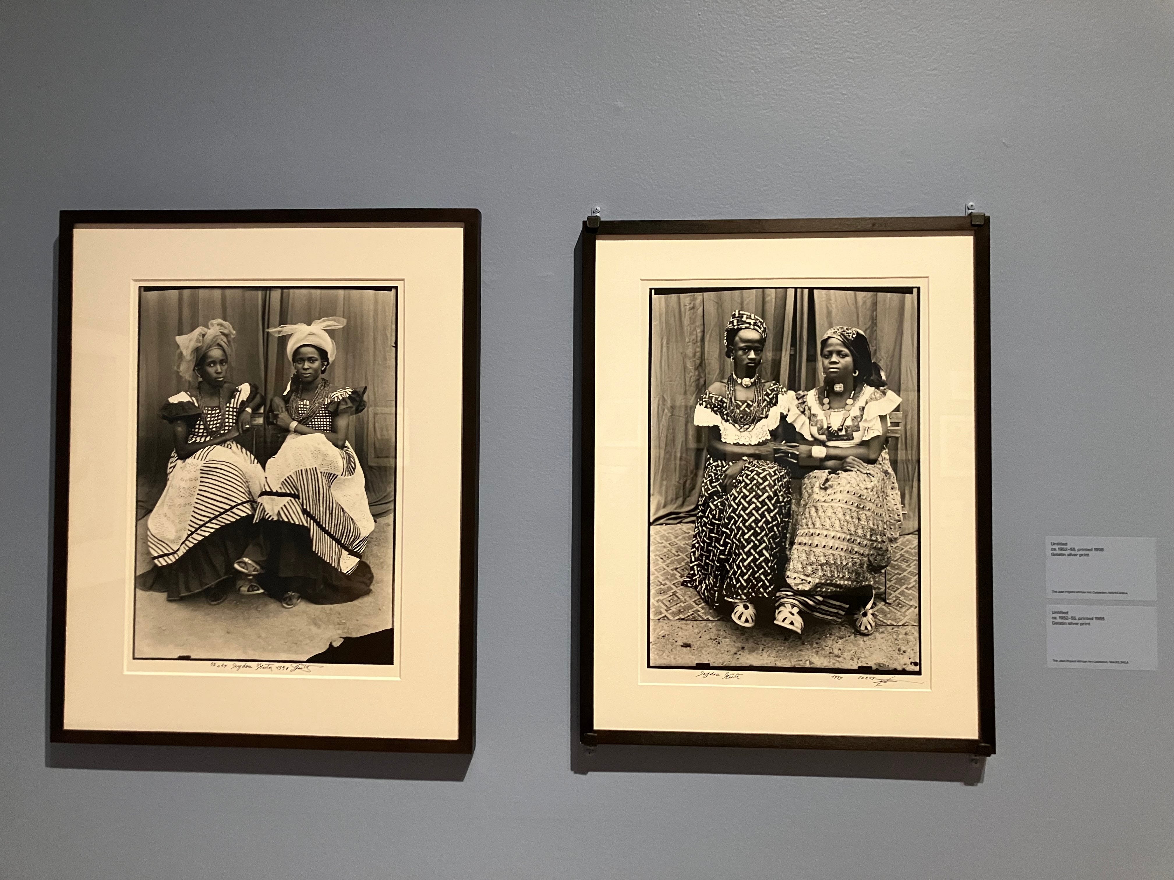 Seydou Keita ran a successful portrait studio in Bamako, in what is now Mali, in the 1950s and 1960s. In this major retrospective at the Brooklyn Museum until May 17 you can see the range of his work, and his ongoing interest in patterns and repetition. Often he pairs two figures together, like these below. Notice how in the photo on the left the dresses are arranged as carefully as the women, so the hem decoration merges into one line, while the stripes intersect it. Sometimes the women paired are friends or sisters, but sometimes they are co-wives. The women look at us but they bond with each other, through gesture, fashion, and symmetry.